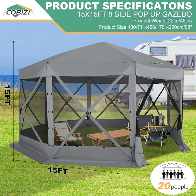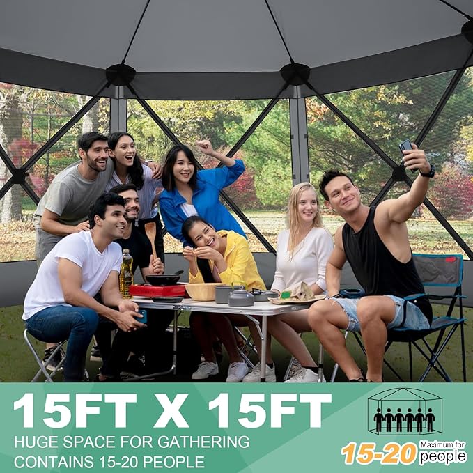 COBIZI 15x15ft Extra Large Pop-Up Gazebo Canopy Tent with Mosquito Netting, Spacious Easy Set-Up Screened Shelter, Durable Outdoor Pavilion with Ground Stakes, Perfect for Patio, Backyard,Gray