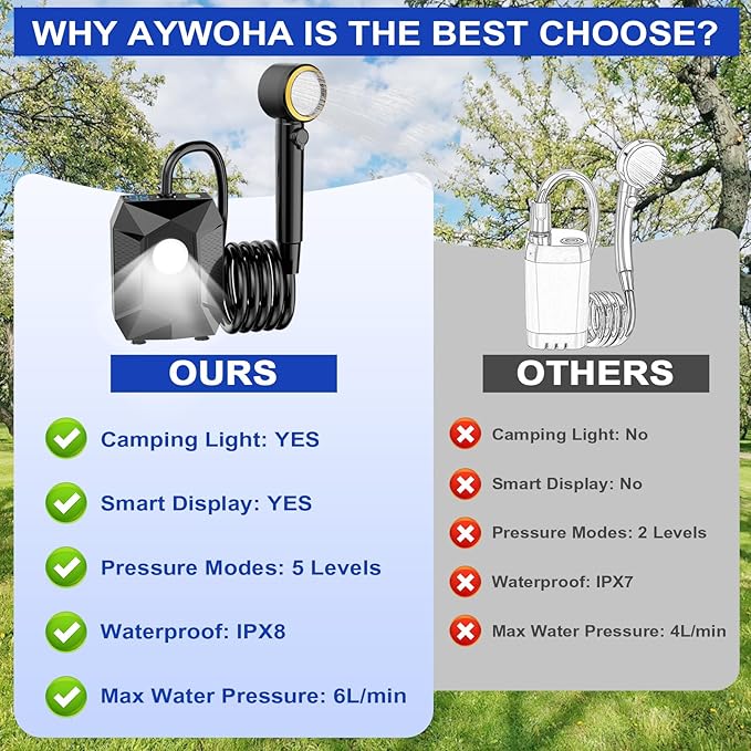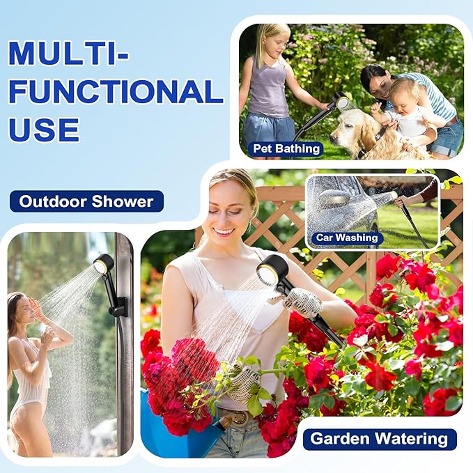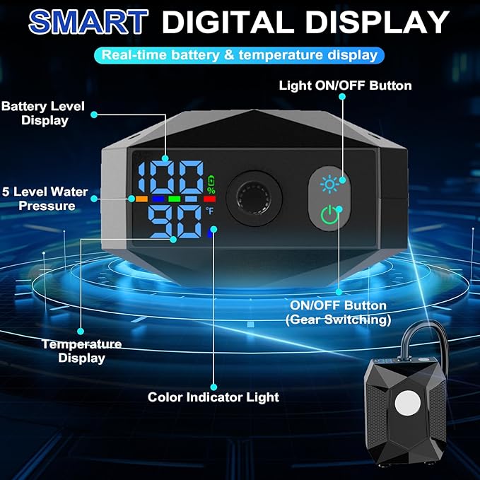 - 【Advanced Smart LED Display】 Our portable camping shower features an upgraded LED display that allows you to clearly monitor the battery level and water temperature in real time. From 50–122°F, you’ll be sure to avoid heat burns and power outages while enjoying your outdoor adventure. Whether you're hiking or relaxing at the beach, this portable shower delivers the latest information with smart technology to enhance your camping experience.