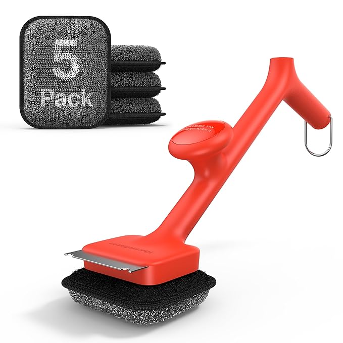 - Strong Bristle-free Grill Brush - Clean With Steam, No Wire Fell Out! Say goodbye to tough residue and grime with our grill brush and scraper combo, which tackles even the toughest grime. You can easily remove grease and stains with 3 replaceable brush heads and a stainless steel scraper. Best of all, our bristle-free design ensures a safe and worry-free clean, without the risk of dangerous wire bristles breaking off and ending up in your food