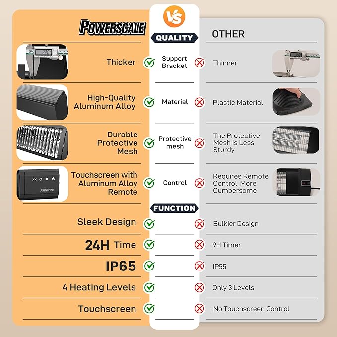 - Built to Last Through All Weather Conditions Engineered with IP65 waterproofing and a tough powder-coated aluminum body, the Cozyray 300 is built for year-round use. Rain, wind, or dust—this outdoor heater keeps working reliably. It's an excellent replacement for traditional fireplace heaters, portable heaters, or pellet heaters for outdoor use—providing dependable warmth no matter the season.