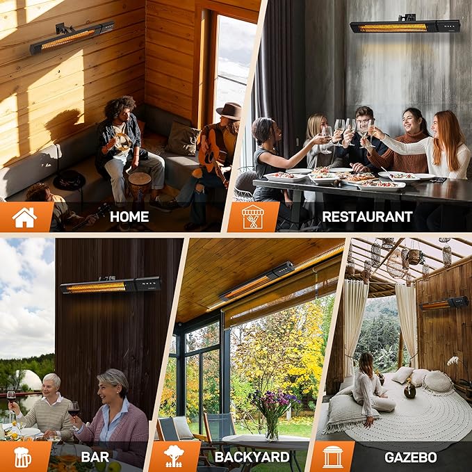 - Flexible Installation for Indoor and Outdoor Use Designed with wall-mounted convenience, this infrared heater easily adapts to any space—whether you're heating a backyard patio, restaurant terrace, home workshop, or garage. Its low-profile design and powerful performance make it a smart choice as a wall heater, electric heater, or space heater for indoor use. It’s perfect for both open-air areas and enclosed rooms.