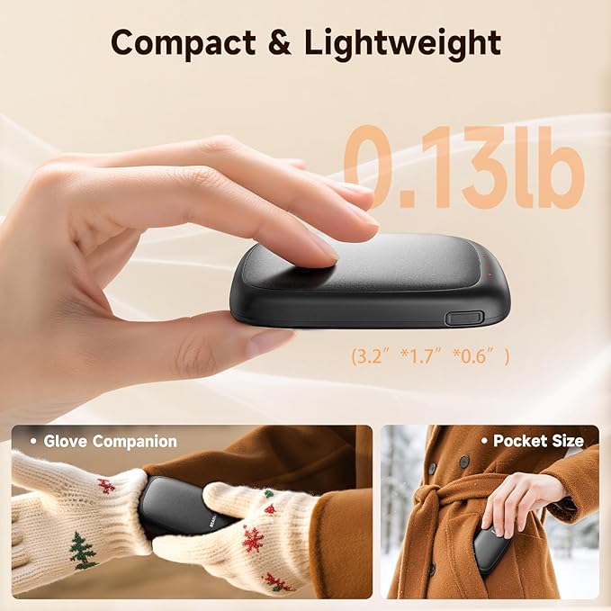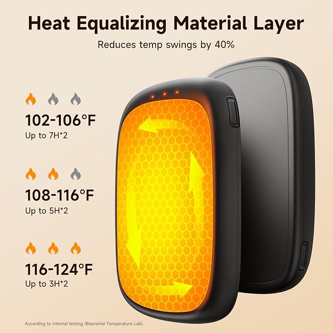 - 3 Heat Levels, All-Day Ready: Set to 104°F, 111°F, or 120°F. Battery lasts about 3-8 hours per charge (varies by level and ambient temperature). Ideal for nighttime warmth, outdoor work, winter walking, and hunting; helpful for cold-sensitive hands (e.g., Raynaud’s).