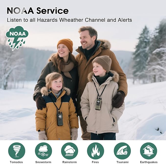 - 【NOAA Weather Scan & LED Flashlight】These walkie talkies support NOAA's National Weather Service, 11 NOAA weather channels provide real-time weather updates to inform you of severe conditions. Built-in LED flashlight can be used as both flash and emergency light, and it is also a explore toy for kids at night. Derebir walkie-talkies come with multi-features as volume adjustment, Auto memory, Auto scan, Keypad lock(Channel-lock), Drop-protection etc.