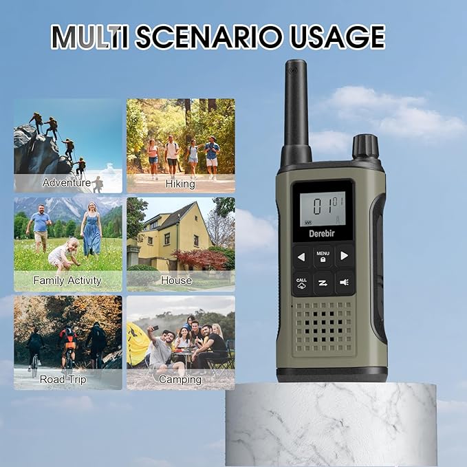 - 【VOX Hands-free & Clear Sound】Derebir rechargeable walkie talkies for adults have easy voice and sound activation transmission (VOX) with 3 sensitivity levels for hands-free operation. Our long range walkie talkies come with upgraded large speakers with 150% more volume, noise reduction technology and stronger penetration, you can hear clear sound without distortion even in noisy environments