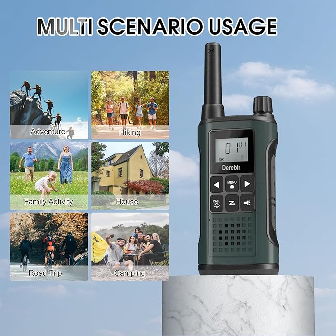 - 【VOX Hands-free & Clear Sound】Derebir rechargeable walkie talkies for adults have easy voice and sound activation transmission (VOX) with 3 sensitivity levels for hands-free operation. Our long range walkie talkies come with upgraded large speakers with 150% more volume, noise reduction technology and stronger penetration, you can hear clear sound without distortion even in noisy environments