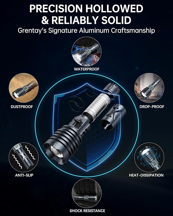 - ☀️Super Bright & Long Rang LED Flashlight:The Grentay bright flashlight is equipped with the latest LED beam and zoomable function. As long as you hold the lamp head and extend it forward to the longest distance, it can become a spotlight flashlight that can illuminate objects up to 8000ft away; Pushing the lamp head inward will turn it into a floodlight with a maximum output of 5800.000 lumens, which can illuminate the entire football field.