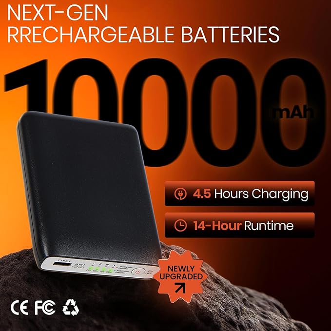 - 10000mAh & 14-Hour Runtime: The heated socks feature next-gen rechargeable 10000mAh batteries, delivering sustained warmth for 4.5 to 14 hours, with a maximum temperature of 122°F—ideal for all-day commutes, extended travel, or extreme outdoor adventures. With 4.5-hour ultra-fast charging (66W) — 20% quicker than industry average, they're backed by UL & FCC dual safety certifications to ensure comprehensive protection against overheating, short circuits, and other risks.
