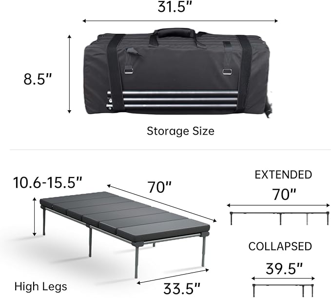 - 【Multi-level Adjustment 】:The cot height and length are freely adjustable, easily adapting to different spaces. Whether it's a long road trip or a short camping getaway, find the most comfortable sleeping angle for you.