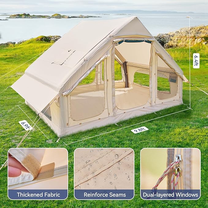 - 4-6 Person Spacious Interiors with Ample Headroom: Our 9.8'L x 6.9'W inflatable tent offers 67.8 sq ft of space, accommodating 4-6 people and gear (refer to pic). With a 6'4.7" high ceiling for tall individuals, it provides ample stand-up space and walk-around comfort. 2'7.5" walls suit family/group camping needs.