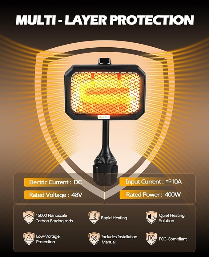 Golf Cart Electric Heater, 400W Safe and Quiet Carbon Fiber Heating, Heat Up 120 Square Feet for 48V Club Car/Yamaha/EZGO Golf Cart Battery Operated Heater & Cup Holder Adapter, Black
