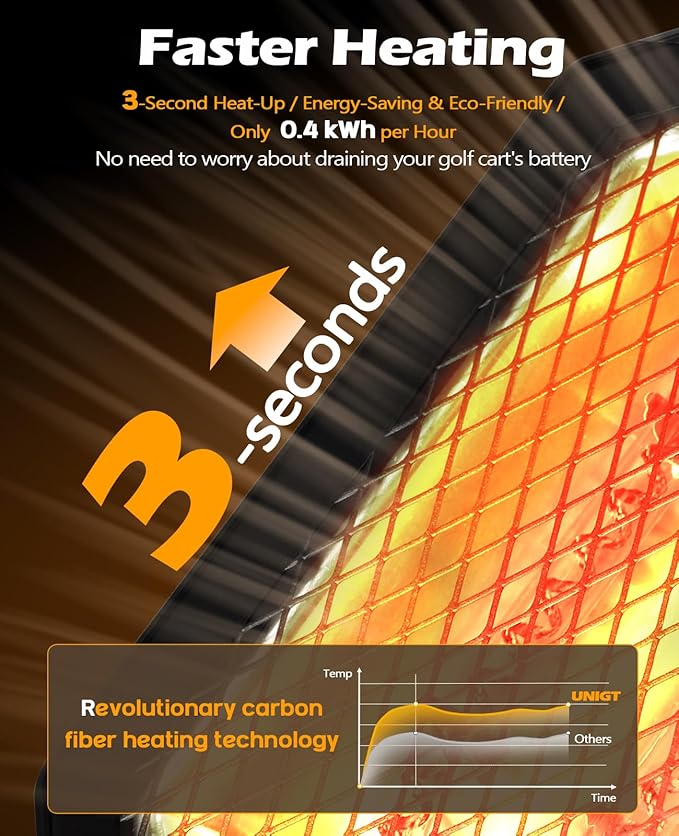 - Easy Installation & Eco-Friendly Operation - Simply connect to your golf cart's power system for instant use. This zero-emission heater delivers rapid warmth in just 3 seconds - consuming only 0.4 kWh per hour, no need to worry about draining your golf cart's battery