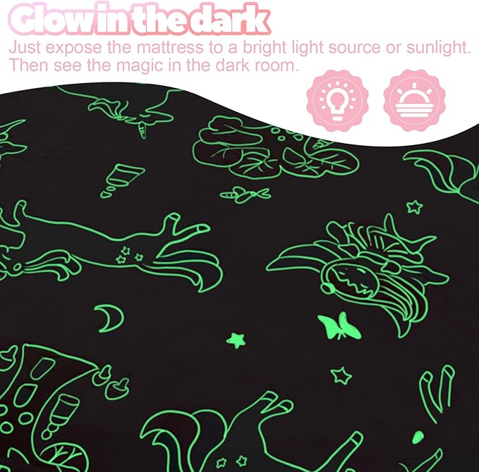 - Glow in the Dark: The thin small mattress is made of glowing plush material. Just expose the trifold kids mattress to bright light sources or sunlight, then take it to a dark room to see the glowing fairy and elf