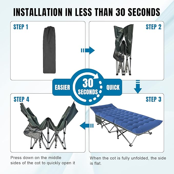 - Easy setup: The folding camping cot can be set up quickly and easily. It can be used unfolded or folded up in seconds. (Note: Press on the cot's middle to flatten it.) Put it in the included carrying bag to store it at home or in your car. If you have any questions, please contact us, and we will help you