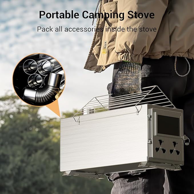 - Compact & Portable Tent Stove -- All accessories store neatly inside the stove itself. The foldable legs and side shelves that double as carry handles make storage and transportation effortless.