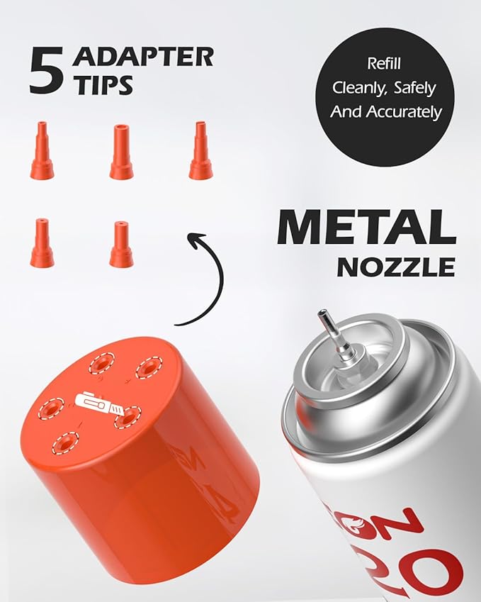 - 【Precision Metal Nozzle & 5 Interchangeable Adapters】 This lighter fluid refill features a durable metal nozzle and 5 universal removable butane gas refill adapters to ensure leak-free refills. You need to separate the adapters with a knife from the butane cap, then connect the suitable adapter to the metal nozzle for compatibility with most lighters, torches, and refillable devices. Leak-free, accurate, and easy to use for a secure refill every time.