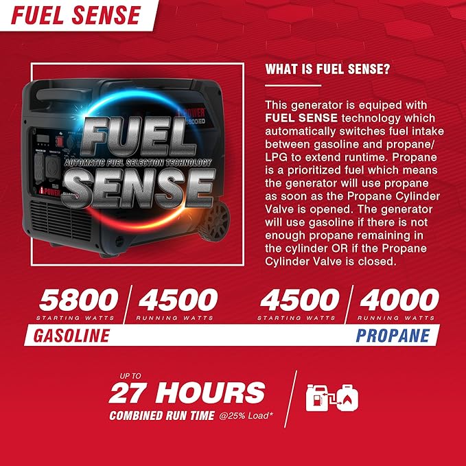 - Long Runtime: 2.6-gallon tank provides up to 10 hours at 25% load—ideal for camping or extended backup