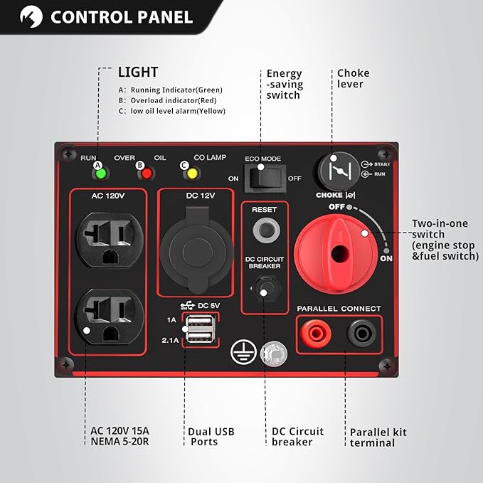 - 【4 Stroke 79cc】OHV engine generator with 2500 starting watt and 1900 running watt, inverter technology produce clean power (less than 3% THD)