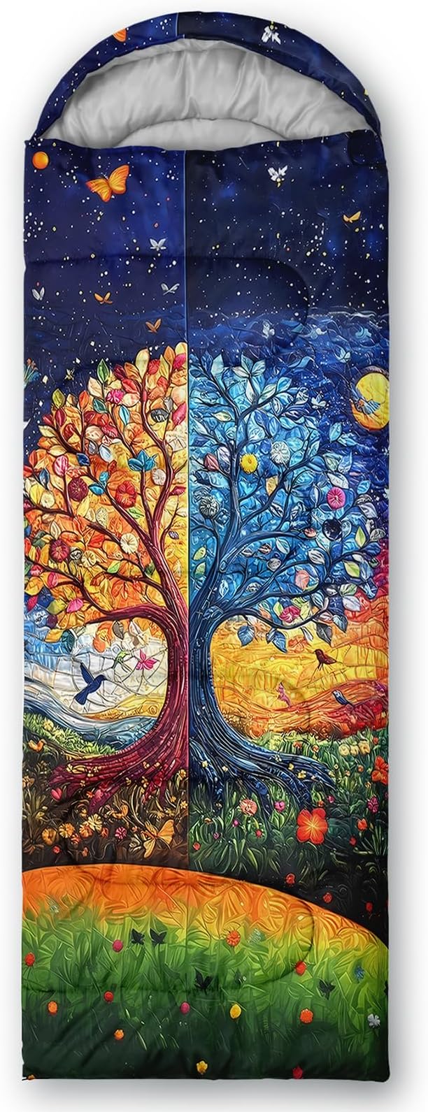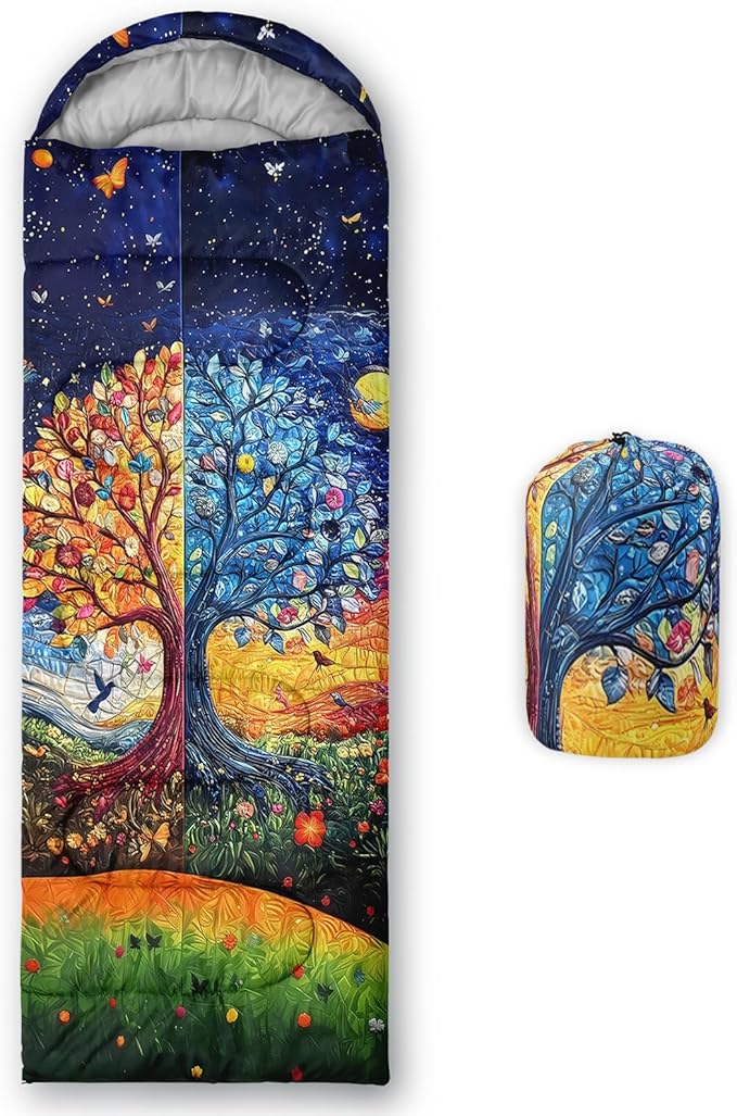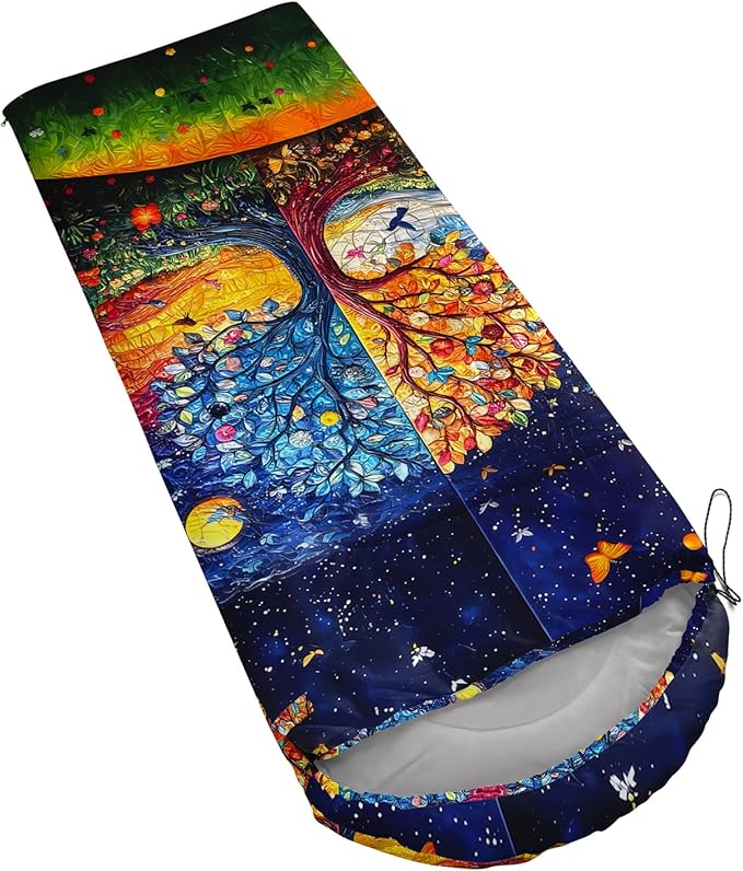 - Unique Tree of Life Design:This Tree of Life pattern sleeping bag is made of 3D digital printing with vibrant colors and patterns,size: 31W x 90L inches,temperature range: 32℉-77℉ (0℃-25℃),it also also have a weather resistant waterproof design to keep you warm and prevent you from any dampness,can be used in 3 seasons