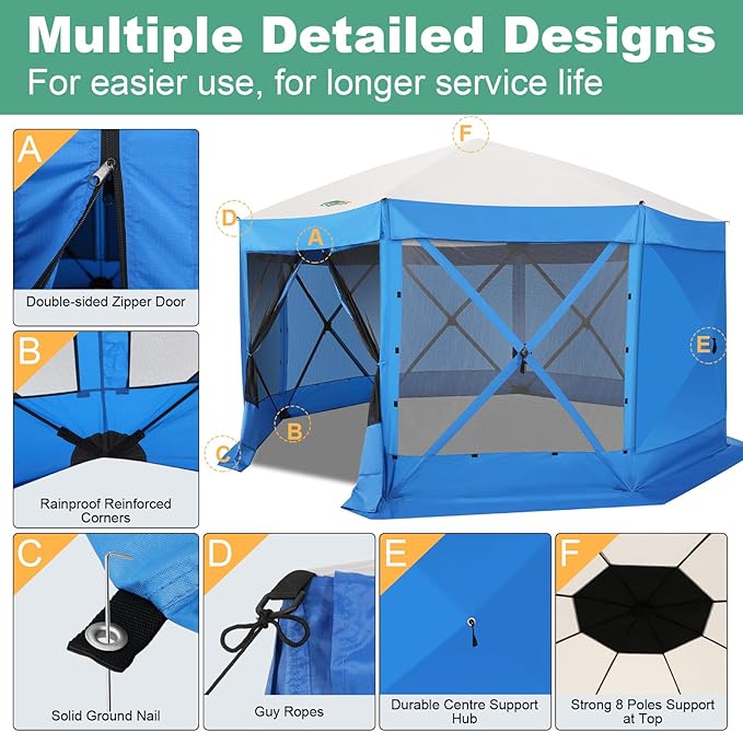 - ✅【Comprehensive Packing List & Warranty】 Your purchase includes 1 canopy tent Gazebo with Frame, 1 Upgraded Carrying Bag, 2 Door Frame Poles, 24 Stakes, 15 Ropes, 7 sidewalls and a User Guide. If any accessories are missing or damaged, please contact our customer service for prompt replacement. Note please: Upon first opening, the screen tent may appear inside out. This is intentional for compact storage. Do not attempt to reverse it, as it may cause damage to the gazebo.