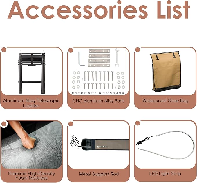 - Included Components : Aluminum Alloy Telescopic Ladder, LED Light Strip, Premium High-Density Foam Mattress, Rainfly, Waterproof Shoe Bag Aluminum Alloy Telescopic Ladder, LED Light Strip, Premium High-Density Foam Mattress, Rainfly, Waterproof Shoe Bag