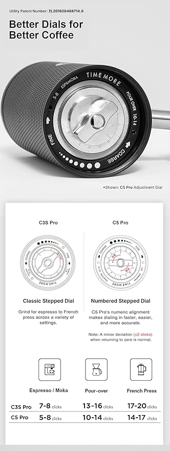 - What is TIMEMORE Chestnut C5 Pro Manual Coffee Grinder:Equipped with patented S2C-042-III stainless steel burrs with higher precision and efficiency. C5 Pro hand coffee grinder provides more precise grinding adjustment, minor adjustment of 0.031mm per click allows you to easily achieve the perfect coarseness for your preferred fine to coarse. From Pour Over Coffee to French Press to Espresso Coffee, TIMEMORE has you covered