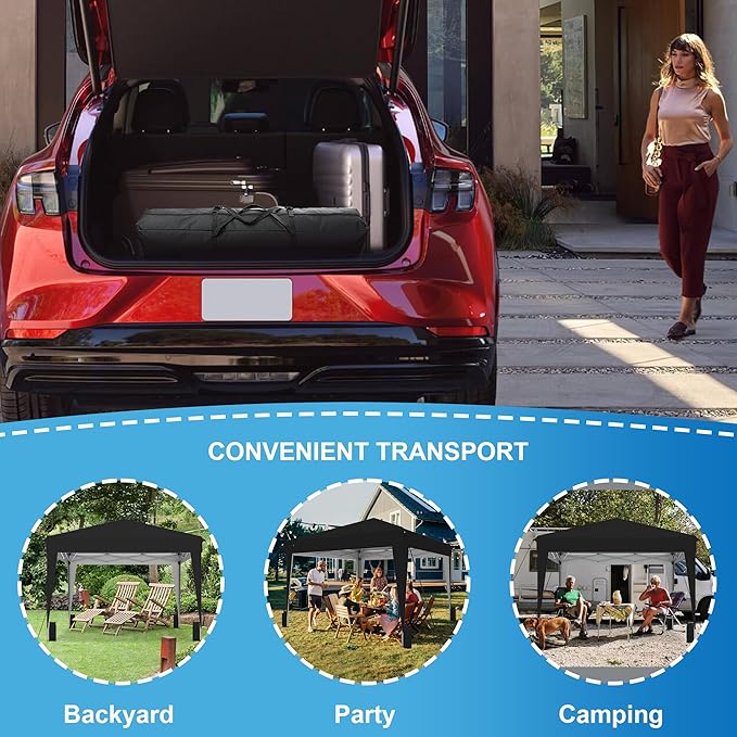 - EASY ONE-CLICK SETUP: The 10x10 pop up canopy tent features central one-button locking system. This outdoor canopy for patio can be easy and fast setup or takedown in seconds without tools, perfect tent for camping, tailgating, beach, backyard events, farmer markets and outdoor parties.