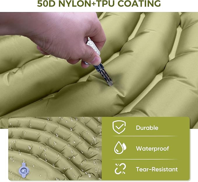 - ✅ 【Tough, Waterproof & Quiet】Made with 50D nylon and TPU coating, this camping air mattress is waterproof, tear-resistant, and ultra-durable. It stays quiet when you move and performs well in harsh conditions. Easy to clean and reliable—your go-to inflatable mattress for outdoor adventures.