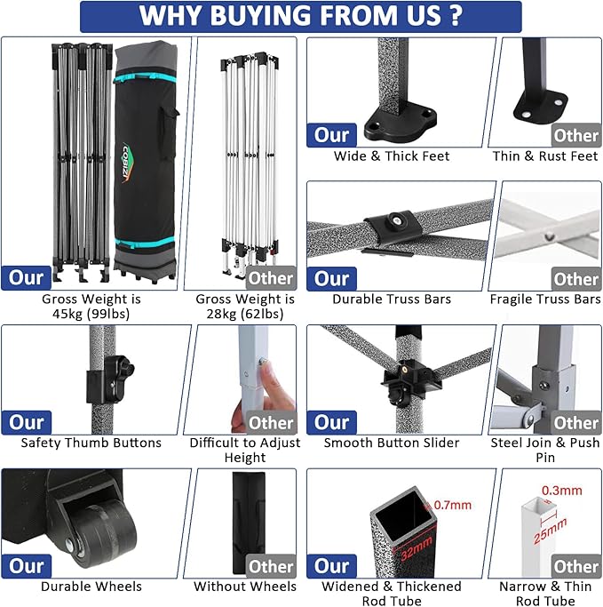 - 【Heavy Duty Alloy Steel Frame】The upgraded 10x20 commercial pop up canopy tent frame can hold up to 220 lbs (100 kg) on a single pole. The frame can hang 8 adults at the same time! Can withstand 4 winds.(<18 mph). 10x20 party tent with an upgraded alloy steel full truss structure, and reinforced plastic parts at the stress points at the intersection of the peaks and poles. 10x20 heavy duty canopy frame with powder coated coating guarantees rust resistance and corrosion resistance.