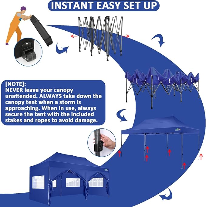 - 【3 Height Settings】10x20 pop up party tent straight leg has 3 height settings. Thumb latch lock system easy to lock and release, raise the pop up tent to a desired height. Canopy tent 10x20 straight leg height options: 220cm/86.6inch, 230cm/90.6inch, 240cm/94.5inch. Corresponding party tent center height options: 310cm/122.0inch, 320cm/126.0inch, 330cm/129.9inch. 10x20 canopy with sidewalls perfect for commercial activities, camping, festivals, tailgating, backyard events and etc..