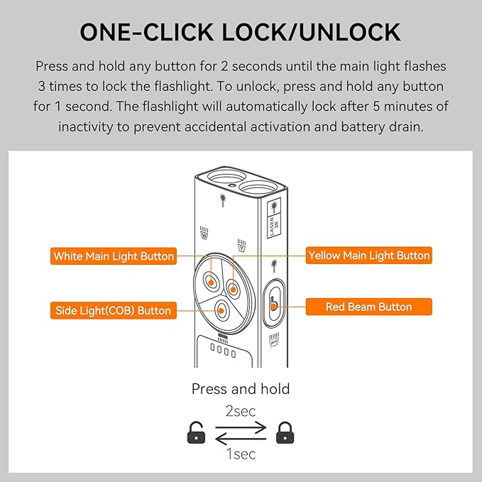 - Smart Lock Mode: Press and hold any button for 2 seconds to enter locked mode; press and hold any button for 1 second to unlock. When powered off, the flashlight will automatically lock after 5 minutes of inactivity, effectively preventing accidental activation in pockets and reducing power consumption.