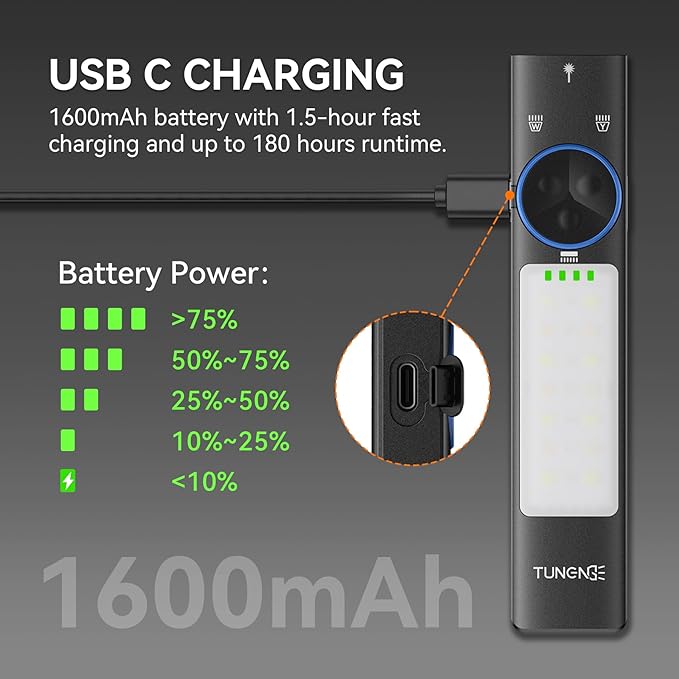 - Visual 4-Level Battery Indicator: Built-in 1600mAh battery charges fully in 1.5 hours via universal Type-C cable (with indicator light). Compatible with power banks, laptops, car chargers, and more. Offers up to 180 hours in moonlight mode, perfect for camping, dog walking, power outages, and emergencies.