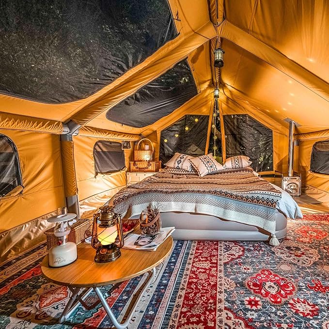 - Waterproof and Windproof inflatable tent with stove jack: The luxury tent 4-season big tents for camping, with a stove hole, handles rain, wind, snow, and sun. Inflatable tent for camping ideal for summer, spring, and fall, it stays cozy above 32°F (0°C). Includes accessories for winter camping. For heavy rain, use the included rain fly.
