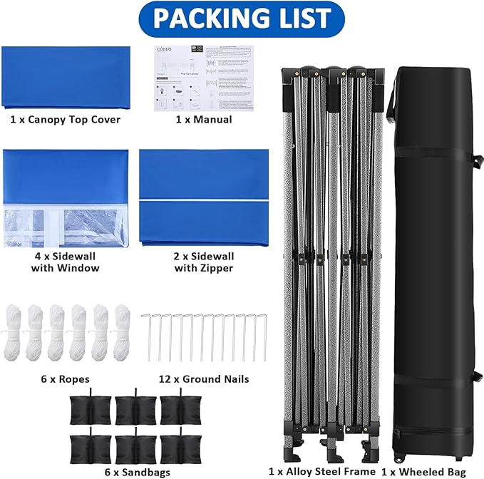 - 【Wheeled Storage Bag】10x20 canopy wheeled roller bag size is 169x46x24cm (66.5x18.1x9.4inch), 600D Oxford Cloth fabric. Storage bag with 3 wheels on the bottom for easy transport. 3 handle on the side for 2 people to lift. 1 handle on the top for 1 people to glide. The Package Includes: Pop up Canopy Frame x 1Pcs + 10′x20′ Canopy Tent Top Cover x 1Pcs + Sidewall with Zipper x 2Pcs + Sidewall with Window x 4Pcs + Sandbag x 4Pcs + Ground Nail x 12Pcs + Rope x 6Pcs + Wheeled Storage Bag x 1Pcs.