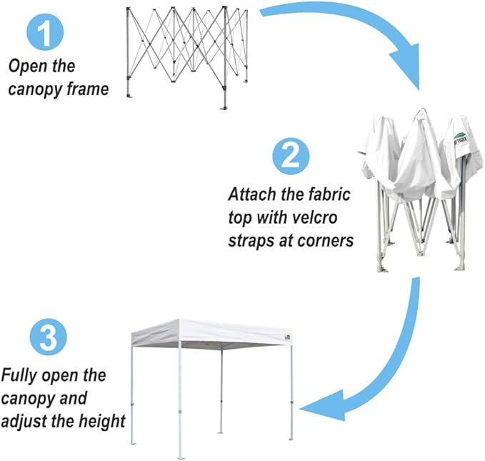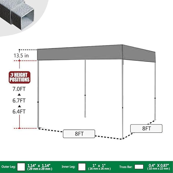 - 8x8 Commercial grade canopy tent frame: (1)Strong full truss structure design. (2)Hammertoe powder coated finishing. Good looking and rust resistance. (3)The latest thumb lock system, easy to lock and release. Three Height positions, clearance height from-peak Height from 9.8Ft, 10.1Ft to 10.4Ft. Set up and take down easily by 1 or 2 person in minutes without any tools.
