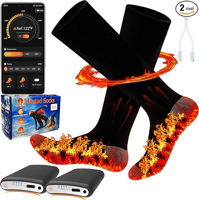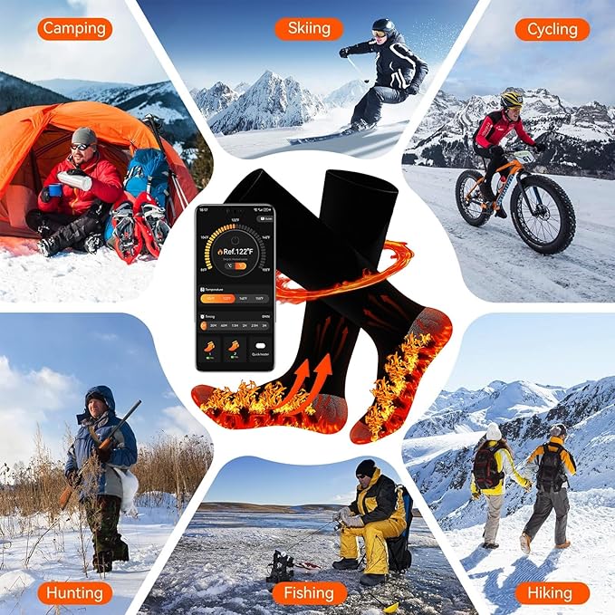 - 【Newly Upgraded】We have upgraded and enhanced the heated socks Smart APP,industry-leading, easy to use,Newly added one click quick heating heated socks,remaining Battery display, timing OFF electric socks, Fahrenheit and Celsius switching, function can clearly show the heated socks situation,preparing you for your adventures. you can Sliding adjustment any temperature between 86 ℉ and 158 ℉ via,Not just high - medium - low temperature settings.Find Your OwnTemperature Anytime, Anywhere.Very easy