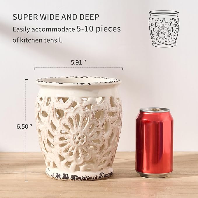 - ๐๐ญ๐๐๐๐ฒ ๐๐จ๐ฅ๐๐๐ซ : The utensil crock is made of ceramic, that is heavier than plastic and stainless, so it will not easily to move when you use it. The ceramic utensil holder is more stable, avoiding falling down and spilling all over the place.