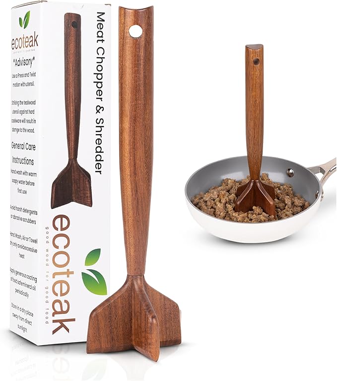 - Premium Teak Wood Crafted - Unlike nylon choppers, this wooden meat masher is made from natural teak wood, known for its durability, strength, and food-safe properties. Its four blades are tough enough to handle ground beef, chicken, and more, while staying gentle on cookware. A sustainable and eco-friendly alternative for everyday cooking.