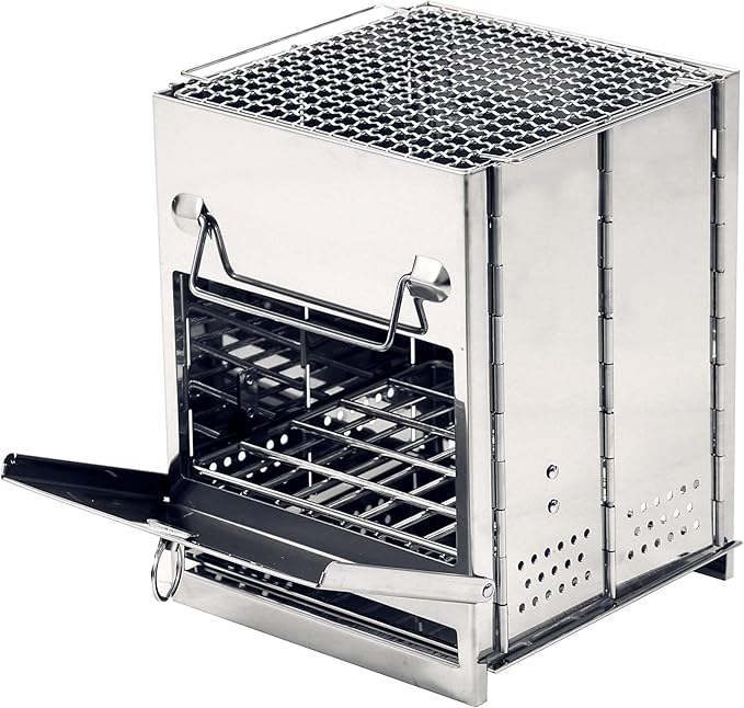 - BACKPACKING STOVE: Eat well wherever adventure takes you with this camping stove wood grill. With a compact foldable design and a durable stainless-steel construction, this small wood stove makes it easy to prepare delicious meals and snacks on-the-go.