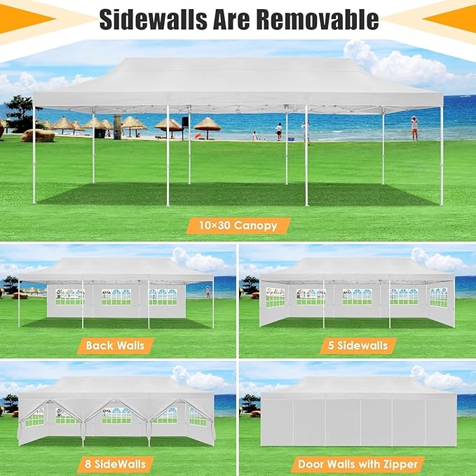 - THICKENED FABRIC 100% WATERPROOF & UPF 50+: 10x30 pop up canopy is made of 420D PU waterproof oxford fabric, which are fully sealed with waterproof strip technology, 100% waterproof. UPF 50+, blocks 99% of the sun's rays. PA coating sidewalls are more light-transmitting and wind-resistant, keep the light inside well. 8 pieces removable walls are attached by the whole Hook-and-loop fastener strip. Install Hoteel tents for parties according to your needs