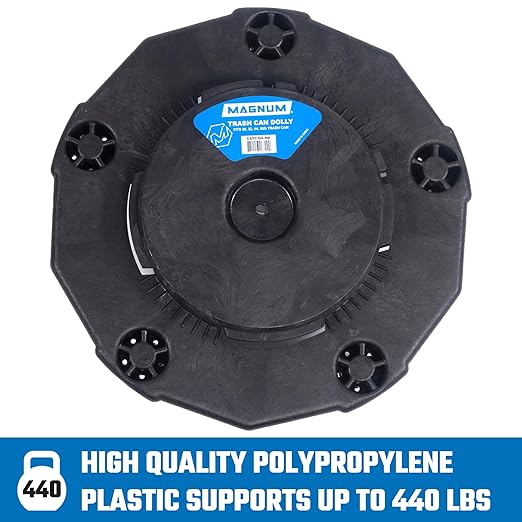 - DURABLE HEAVY DUTY PLASTIC: Our construction grade trash can is made of high-quality plastic resistant to UV rays, making this garbage can perfect for even the most extreme environments, without fading, warping, cracking or crushing. Our premium garbage can dolly is made with high quality polypropylene plastic designed with sturdy structural supports along the casters providing a firm trash can roller base able to support up to 440 lbs of refuse.