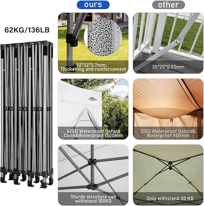 - 【Quick setup, 3 height adjustable】Pop up canopy tent can accommodate 20-30 people and can be set up quickly for 2-3 people in a short period of time without tools. And offers 3 adjustable heights, adjustable range in size from 6.2ft/74.4in to 6.4ft/76.8in to 6.6ft/79.2in, providing excellent headroom for different uses, you can adjust the canopy to your liking. This commercial canopy is suitable for outdoor events, parties, weddings as well as yard additions and other commercial uses